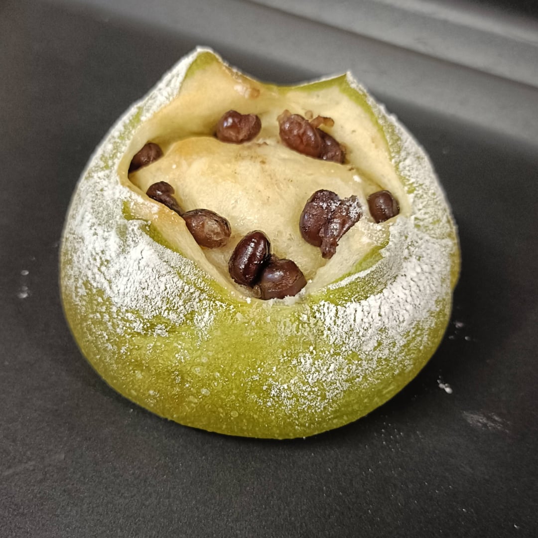抹茶の風味豊かな生地に、甘さ控えめの大納言を加えた特製菓子パンです。しっとりとした口当たりと、抹茶の香りが広がる上品な味わいが特徴で、和のおやつとしても大変おすすめ。ティータイムやちょっとした贈り物に最適な一品です!
