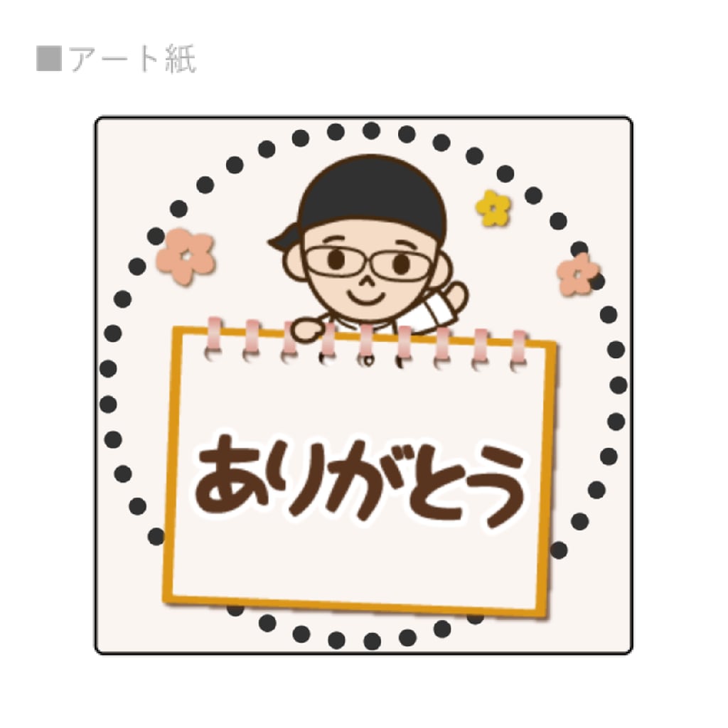 デザインは、ボードを持ってニッコリ微笑むシモガマ先生と、温かみのある**「ありがとう」**の文字。 3.5cmの正方形は、個包装したパンの袋を留めたり、ラッピングのワンポイントにするのに「ちょうどいい」サイズ感です。